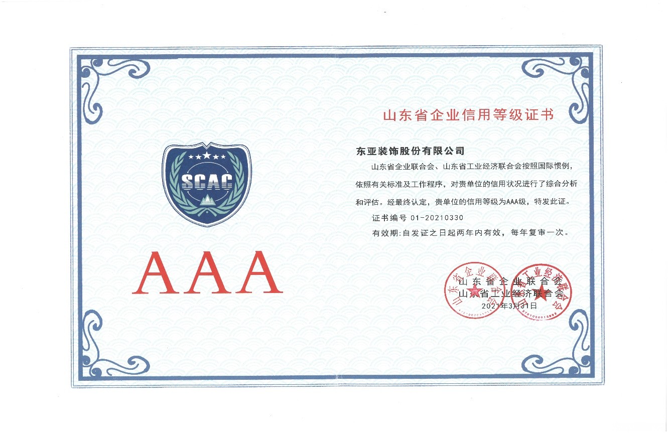 近日,山东省企业联合会、山东省工业经济联合会按照国际惯例,依照有关标准及工作程序,对东业装饰的信用状况进行综合分析和评估,最终认定太阳成集团tyc9728信用等级为AAA级,彰显了企业雄厚的实力及良好的社会信誉。