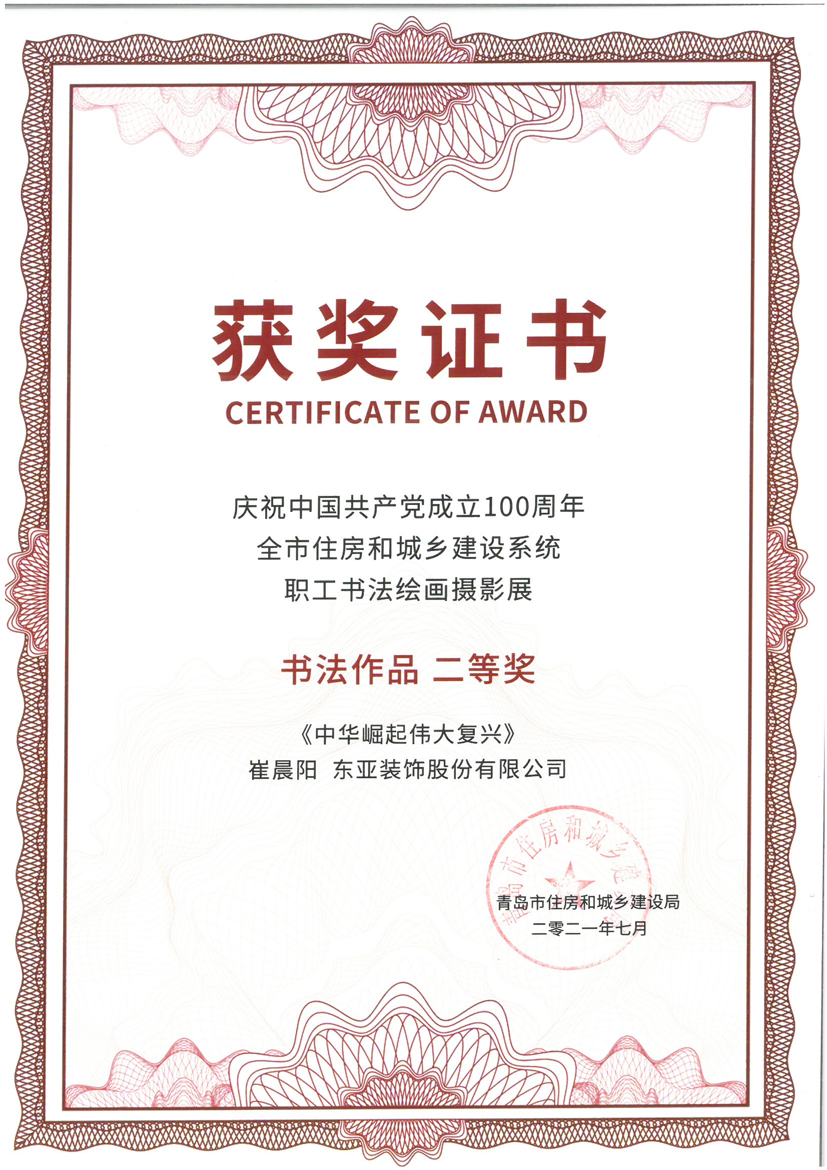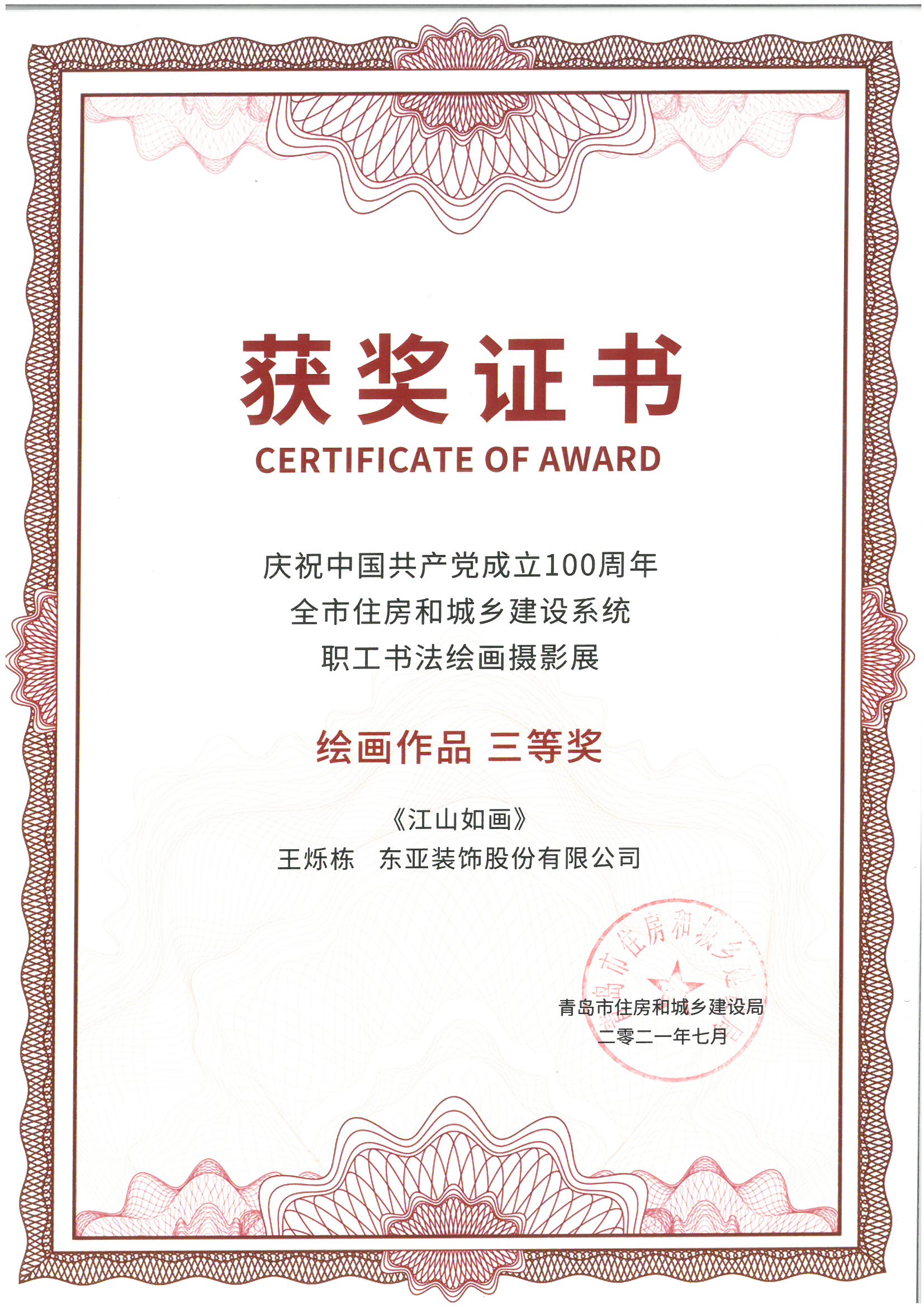 近日,青岛市住房和城乡建设局发布《关于“庆祝中国共产党成立100周年全市住房和城乡建设系统职工书法绘画摄影展”获奖情况的通报》,太阳成集团tyc9728员工积极参与此次展览,获二等奖一项、三等奖三项,并荣获“优秀组织奖”的称号