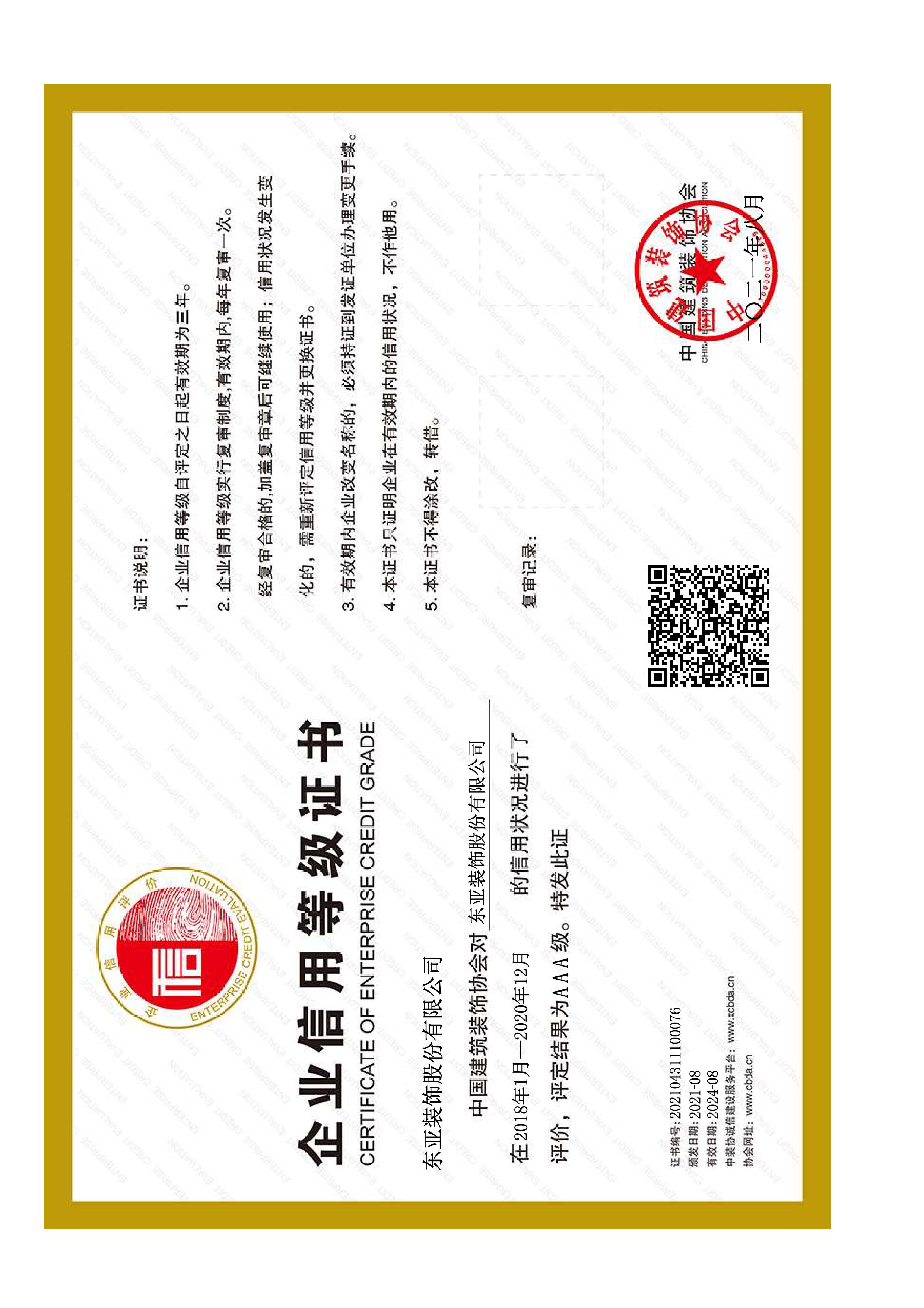 近日,在中国建筑装饰协会组织的2021年度建筑装饰行业信用评价中,太阳成集团tyc9728再度荣获AAA级企业信用等级证书,为公司今后在企业经营活动中进一步树立了良好的诚信品牌形象。