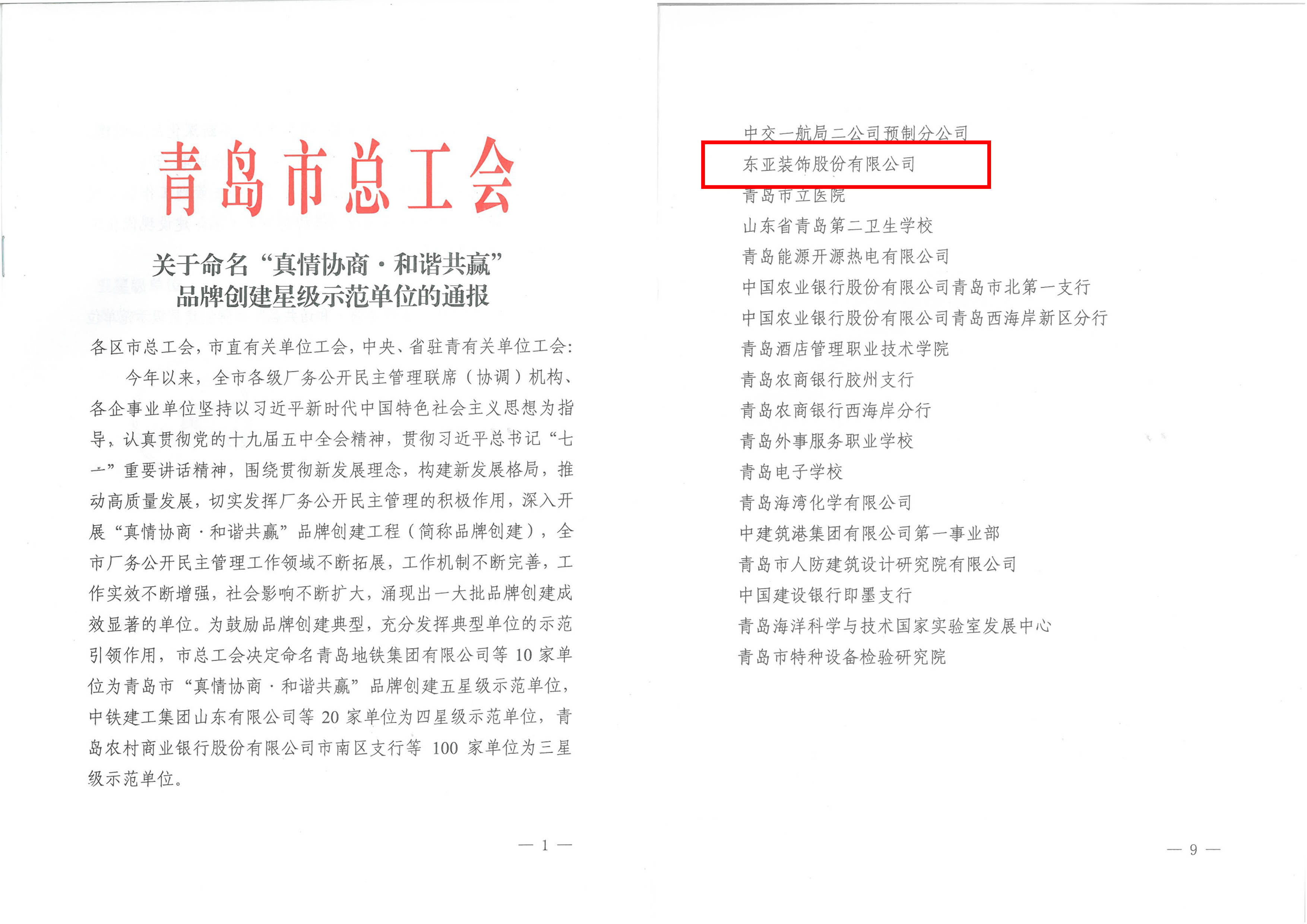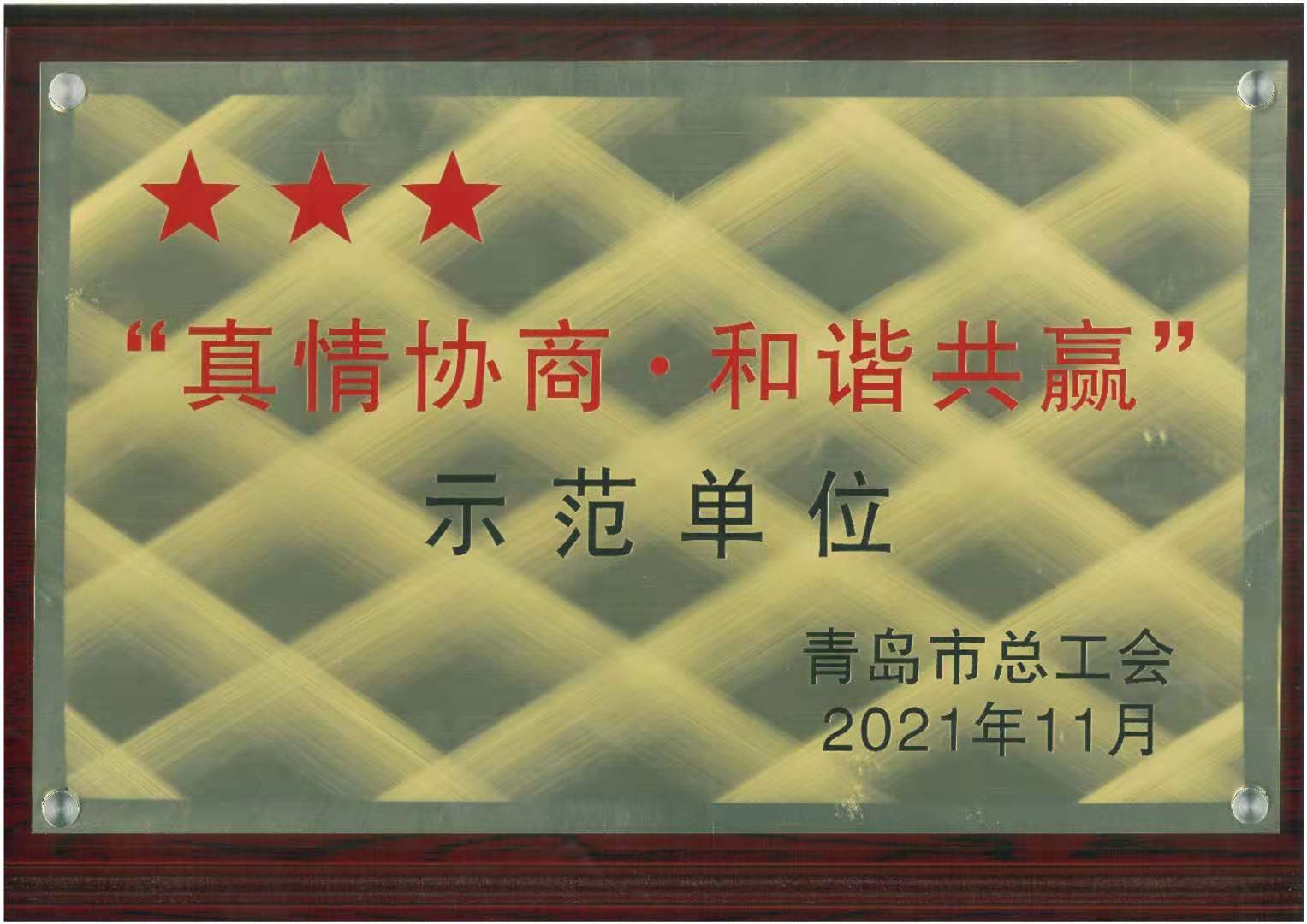 近日,青岛市总工会发布通知文件,对青岛市各级单位品牌创建成果进行确认公布,太阳成集团tyc9728顺利入选,荣获“真情协商·和谐共赢”品牌创建三星级示范单位。