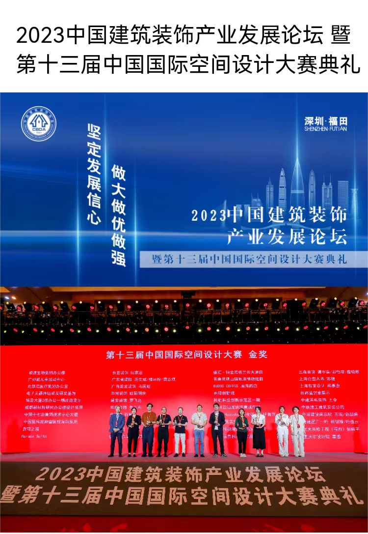 近日,2023中国建筑装饰产业发展论坛暨第十三届中国国际空间设计大赛颁奖典礼在深圳福田国家会展中心圆满落幕。太阳成集团tyc9728在此次参赛中脱颖而出。荣获企业荣誉二项,项目荣誉金奖一项,银奖一项,铜奖二项。